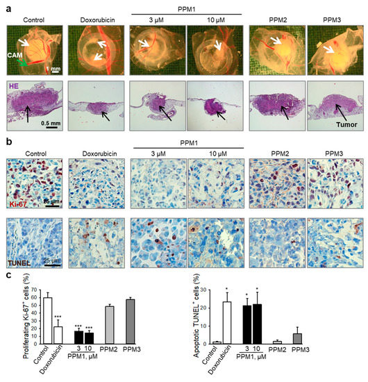 PPM1 induces apoptosis and inhibits growth of breast cancer xenografts in vivo. MDA-MB-231 cells were grafted onto the chorioallantoic membrane (CAM) of fertilized chick eggs. Next day, the tumors were topically treated with PPM1 (3 or 10 µM), PPM2 (10 µM), PPM3 (10 µM), or doxorubicin (10 µM) for 3 consecutive days. (a) Representative pictures from 4 biological replicates are shown. Upper panel: Pictures of tumor xenografts taken immediately after extraction. White arrows—tumors. Lower panel: hematoxylin and eosin staining (HE) after histological preparation, original magnification 50×. Black arrows—tumors. (b) Upper panels: Immunohistochemical analysis of tumor cell proliferation using nuclear Ki-67 antigen (proliferation marker, dark violet nuclear stain). Nuclei were counterstained with hematoxylin (blue). Original magnification 200X. Lower panels: TUNEL staining (TdT, dark brown) for detection of cells with fragmented DNA as apoptosis marker. Original magnification 200X. (c) Graphs show quantification of tumor cell proliferation and apoptosis. Statistical analysis was performed by using the Newman-Keuls test, n = 3–4, * p < 0.05, *** p < 0.001 vs. control.