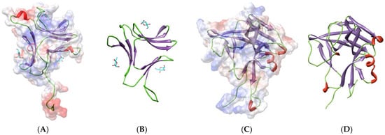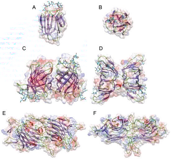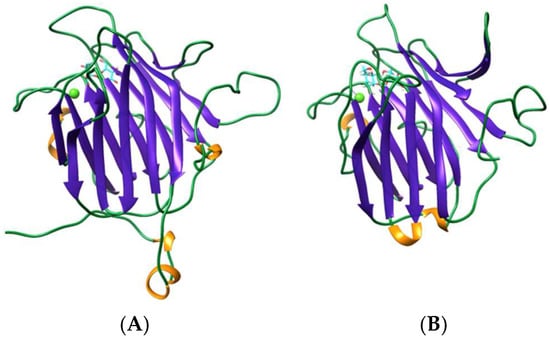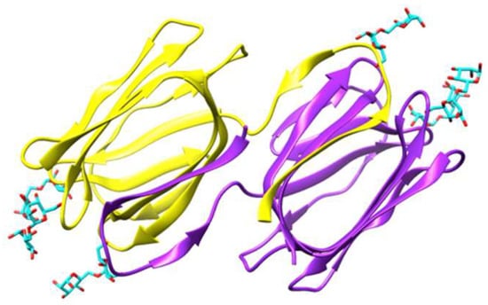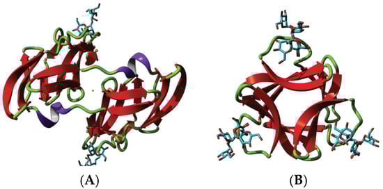 The lectin BPL-2 from the green-yellow alga Bryopsis plumosa, has been characterized as a man-specific lectin structurally-related to MFP2, a protein involved in the nematod sperm cell mobility []. The lectin consists of three β-harpins which adopt a triangular disposition to form a sort of β-trefoil structure (Figure 4). In silico docking experiments performed with mannose, suggest the occurrence of a single active CBS in the BPL-2 lectin (see Section 4.5).