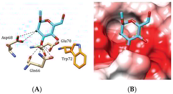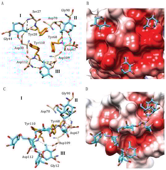 A network of seven hydrogen bonds between O3, O4, O5 and O6 of mannose and Ser27, Tyr28, Asp30 and Gly44 of CBS I, Asp67, Tyr68, Asp70 and Gly90 of CBS II, Asp109, Tyr110 and Asp112 of CBSIII, accommodates the simple sugar in the monosaccharide-binding pocket of the three CBSs located at the top of the griffithsin domain (Figure 6A). Aromatic Tyr28, Tyr68 and Tyr110 residues also participate in stacking interactions with the pyranose ring of the mannose residues, that reinforces the binding of mannose to the CBS. The occurrence of Asp residues in the monosaccharide-binding pocket communicates a strong electronegative character to the griffithsin CBSs (Figure 6B). A very similar binding scheme has been observed in the griffithsin monomer complexed to glucose (PDB code 2NUO) [], and GlcNAc (PDB codes 2GUE and 2NU5) [,].