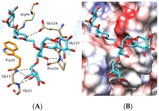 Docking of a two-branched pentamannosyl glycan to the CBS of the modelled EDA-2, the OAAH lectin from the red alga Eucheuma denticulatum, reveals an oligosaccharide-binding scheme very similar to those found in plant lectins, especially in legume lectins, involving an extended area around the monosaccharide-binding pocket. A mannose unit anchors to the monosaccharide-binding pocket while other mannose units interact with amino acid residues located in the vicinity of the pocket via a network of hydrogen bonds and a stacking interaction with the aromatic Trp10 residue (Figure 7A). Like in other lectins, the monosaccharide-binding pocket exhibits a strong electronegative (acidic) character (Figure 7B). Docking experiments performed with other modelled OAAH lectins, e.g., the Solieria filiformis SfL-1 and SfL-2 lectins, revealed a very similar oligosaccharide-binding scheme at the extended CBS of the lectins.