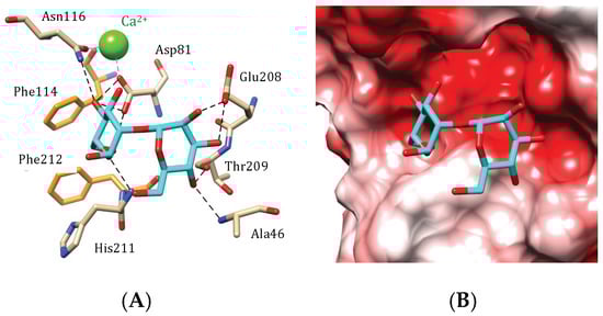 Accommodation of a dimannoside (A,B) at the carbohydrate-binding site of HFA, the Hydropuntia fisheri lectin (modelled and docked, using the PDB code 2DUR as a template). (A) Network of hydrogen-bonds (dashed black lines) anchoring the dimannoside to the CBS. Stacking interactions occur between phenylalanine residue Phe114 and Phe212, and a pyranose ring of the ligand. (B) Coulombic charges (electronegative, electropositive and neutral regions are colored red, blue and white, respectively) at the molecular surface of HFA, showing the electronegatively (red) charged of the carbohydrate-binding cavity that harbors the sugar.