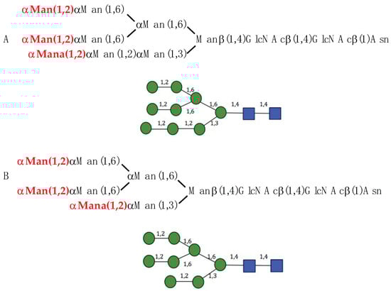 (A,B) High-mannose glycan chains displaying the higher affinity for BCA. The clusters of terminal α1,2-linked mannose units are shown in red bold letters in both oligosaccharidic structures. Symbols for man (