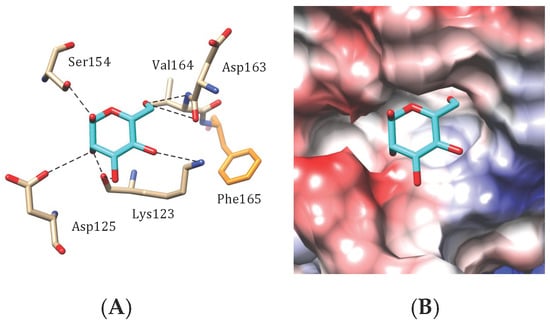 Docking of mannose to the CBS of the modelled BPL-2, the Bryopsis plumosa lectin, suggests a monosaccharide-binding scheme very similar to those observed in other man-specific seaweed lectins (Figure 11A). A network of hydrogen bonds between O1, O2, O3, O4 and O6 of mannose and amino acids Lys123, Asp125, Ser154, Asp163 and Val164 forming a monosaccharide-binding pocket, allows the accommodation of the sugar to the CBS of the lectin. An additional stacking interaction occurs between the pyranose ring of mannose and Phe165. The surface around the monosacchaide-binding pocket exhibits an electronegative (acidic) character (Figure 11B).