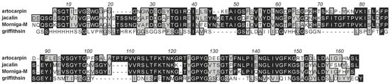 Multiple amino acid sequence alignment of griffithsin and jacalin-related lectins from higher plants (jacalin and artocarpin from Artocarpus integrifolia, frutalin from Artocarpus incisa, and Morniga-M from Morus nigra). Griffithsin shares 25% identity and 70% homology with jacalin-related lectins from higher plants. Sequence alignment was performed with CLUSTAL-X.