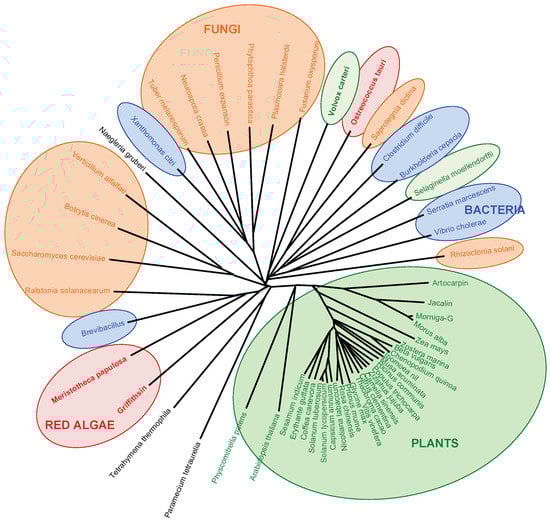 In fact, the jacalin-related β-prism I domain is widespread distributed in all of the living organisms either as an individual lectin, e.g., jacalin or griffithsin, or as a domain associated to other protein components of complex, multidomain proteins from bacteria, fungi and plants, displaying various metabolic functions []. In this respect, the man-specific lectins from red algae are more phylogenetically more closely-related to jacalin-related lectins from higher plants, compared to other jacalin-related lectins of fungal or bacterial origin, as shown in the phylogenetic tree built from the multiple amino acid sequence alignment of various jacalin-related lectins from plants, algae, fungi, bacteria and unicellular ciliates (Figure 13). This is not surprising since different genomes of Rhodophyta reveal some close phylogenetic relationships to Viridiplantae [,,,].