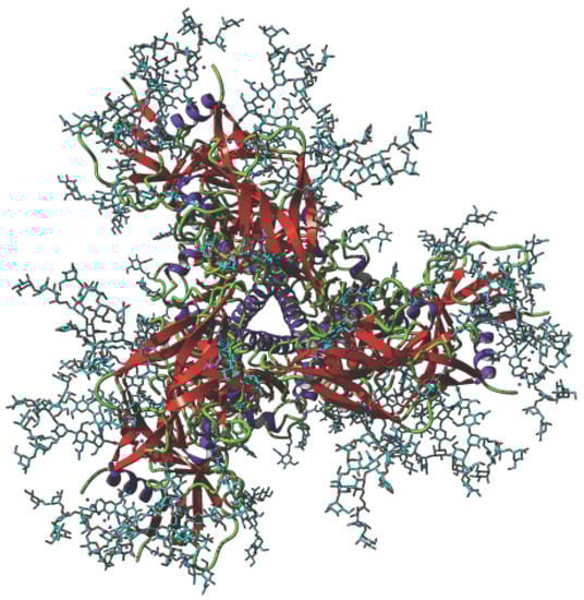 Ever since the high-mannose moiety of N-glycans decorating the HIV-1 gp120 protein has been identified as a target recognized by the CD4+ T-lymphocytes in vitro, a step essential to later promote the virion infection of the host cells, man-specific lectins have been deeply investigated as possible agents able to mask the high-mannose target and thus prevent the HIV infection of the host cells by HIV. In fact, the tandem association of three gp120 molecules with three gp41 molecules forms the HIV-1-envelope spike, which consists of a transmembrane trimer of gp41 associated to an extracellular trimer of gp120 exhibiting the exposed high-mannose glycans necessary for the recognition process of HIV-1 by the CD4+ T-lymphocytes [], (Figure 14). The tandem association of gp120 to gp41 results from the processing of the precursor gp160 by the host cell proteases.