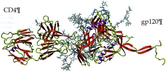 Three-dimensional structure of gp120 complexed to a CD4 molecule (PDB code 5FYK). The high-mannose N-glycan chain decorating gp120 are rendered as cyan colored sticks. Lectins which specifically bind to the high-mannose N-glycans exposed at the surface of gp120, interfere with the recognition of gp120 by the coreceptors of the CD4+ T lymphocytes.