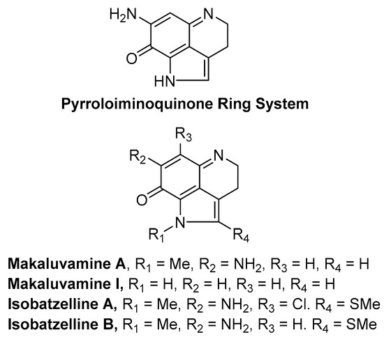 Considering the significance of the quinone compounds in skin cancer therapy, we focused our research on identifying potent quinone-based lead compounds from marine natural products. For more than half a century, global marine sources have proven to be a rich source of vast array of new medicinally valuable compounds [13,14,15,16]. Marine sponges produce a plethora of chemical compounds with widely varying carbon skeletons. Most bioactive compounds from sponges have exhibited a variety of activities such as anticancer, anti-inflammatory and antibiotic activities. Marine sponges of the genera Latrunculia, Batzella, Prianos and Zyzzya are a rich source of alkaloids bearing a pyrrolo[4,3,2-de]quinoline skeleton [17,18]. Their unique fused ring skeletons carry interesting biological properties making them targets for several synthetic and biological studies. Our interest is focused on pyrroloiminoquinone alkaloids which belong to this family. Makaluvamines are a group of pyrroloiminoquinone alkaloids isolated from four species of marine sponges, namely the Fijian sponge Zyzzya cf. marsailis [19], Indonesian sponge Histodermella sp. [20], Pohnpeian sponge Zyzzya fuliginosa [21,22,23] and Jamaican sponge Smenospongia aurea [24]. A few examples of pyrroloiminoquinone alkaloids are presented in Figure 1.
