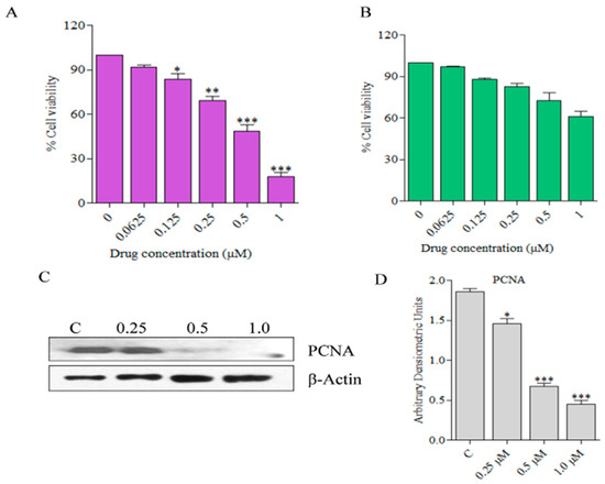 It is important to note that HaCaT cells were affected only at higher doses of the compounds compared to SCC13. SCC13 cells were found to be most sensitive to C278 treatment with an IC50 value of 0.50 ± 0.11 μM, which is almost half of the IC50 value of 1.15 ± 0.20 μM for HaCaT cells. A bar graph for HaCaT cell viability upon treatment with different doses of C278 is presented in Figure 3B. Results of western blot experiments showed that the treatment of SCC13 cells with C278 led to the downregulation in expression of the proliferating cell nuclear antigen (PCNA) in a dose-dependent manner as well (Figure 3C,D). These results suggest that C278 is very effective in killing human skin cancer cells at a dose that is less toxic to a normal immortalized human keratinocytes.
