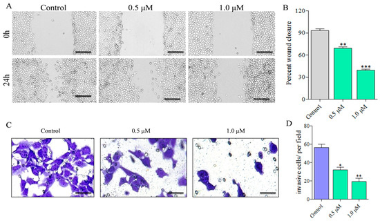 Cancer cells have the ability to migrate and invade at distant sites in the body resulting in metastasis [33,34,35]. To examine whether C278 treatment can inhibit the migration and invasion properties of SSC13 cells, we performed cell migration (wound healing) [36] and cell invasion (trans-well) assays [37,38]. A dose-dependent inhibition of the wound closure was observed as reflected in the micrographs (Figure 4A). Wound closure measurements showed that it decreased significantly to 69.06 ± 2.91% at 0.5 μM treatment which further decreased to 39.53 ± 2.17% at 1.0 μM treatment compared to 93.37 ± 3.35 percentage for the control group (Figure 4B). Similarly, through trans-well assay, we found that there was a dose-dependent decrease in the number of invasive cells as reflected in the micrographs (Figure 4C). Counting the number of the invasive cells showed that it decreased to 32.00 ± 4.24% at 0.5 μM treatment which further decreased to 19.50 ± 4.95% at 1.0 μM, compared to 56.50 ± 4.95% for the control group (Figure 4D). Together, these results indicate that C278 inhibits the migratory and invasive ability of SCC13 cells in a dose-dependent manner.