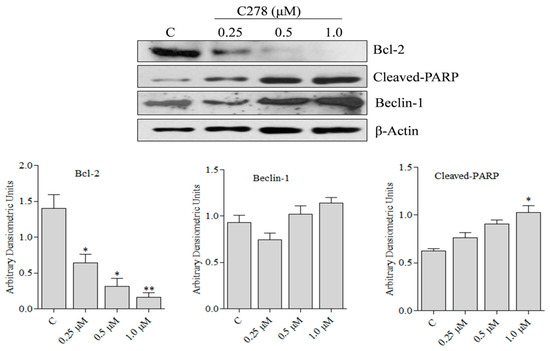 To determine if C278 mediated killing of SCC13 cells involve the modulation in the expression of the pro- and anti-apoptotic genes as well as the activation of autophagy genes, we quantified the expression of the survival protein Bcl-2 [39], an apoptotic marker cleaved-PARP and an autophagy inducing protein beclin-1 through western blot. We found that C278 significantly downregulated the expression of Bcl-2 protein in a dose-dependent fashion. Interestingly, the production of cleaved-PARP and the expression of beclin-1 increased in a dose-dependent manner (Figure 5). Taken together, these results suggest that C278 mediated cell death in SCC13 cells, in part involves apoptosis and autophagy.
