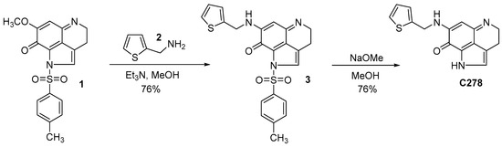 Synthesis of compound C278 was carried out following a procedure previously reported [25,26] from our lab for the synthesis of other similar analogs in two steps starting from a key intermediate compound 1 as outlined in Figure 6. Compound 1 was synthesized in our lab following a previously reported procedure [47].