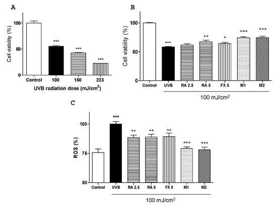 The UVB intensity was selected in a preliminary study in which three different intensities (100, 150 and 225 mJ/cm2) were tested. To study the cell viability was used MTT assay (3-(4,5-dimethylthiazol-2-yl)-2,5-diphenyltetrazolium bromide). As expected, a UVB dose-dependent effect on cell death and morphology was observed. The intensity of 100 mJ/cm2 was chosen for further assays since it allowed over 50% of cell survival and showed a significant difference in comparison with non-irradiated control group (Figure 1A). In addition, MTT results showed that the treatment with RA or FX at 5 µM, M1 (2.5 μM RA + 5 μM FX) and M2 (5 μM RA + 5 μM FX) significantly increased cell viability in UVB-exposed cells, being more effective M1 and M2 treatments (Figure 1B).