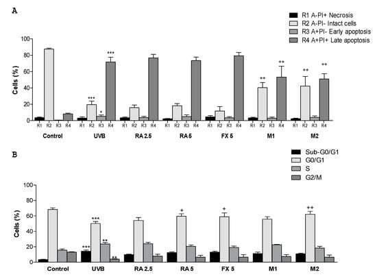 Effect of rosmarinic acid (RA), fucoxanthin (FX) and combinations on apoptosis and cell cycle arrest by using flow cytometry. (A) Results of Annexin V-FITC assay as percentage of cells in different apoptotic phases; R1: necrotic cells (Annexin V-FITC negative, PI positive), R2: viable cells (Annexin V-FITC negative, PI negative), R3: early apoptotic cells (Annexin V-FITC positive, PI negative), R4: late apoptotic cells (Annexin V-FITC positive, PI positive). Cells were pre-treated with RA (2.5 and 5 µM), FX (5 µM) and two combinations M1 (2.5 RA plus 5 µM FX) and M2 (5 µM RA plus 5 μM FX), then were irradiated with selected UVB dose (100 mJ/cm2) and incubated for 24 h. (B) Cell cycle phase distribution of UVB-exposed HaCaT cells. Cells were incubated with treatments for 48 h. Data are expressed as percentage and bars represents mean ± SEM of four independent experiments (n = 4) in duplicate. Results are expressed as percentage and bars represents mean ± SEM of four independent experiments (n = 4) in duplicate. The mean value was significantly different compared with control group (*** p < 0.001, ** p < 0.01, * p < 0.05 vs. untreated cells; Mann–Whitney U-test). The mean value was significantly different compared with UVB-irradiated cells + p < 0.05, ++ p < 0.01 vs. UVB-irradiated cells; Kruskal–Wallis test followed by Dunn’s multiple comparison test).