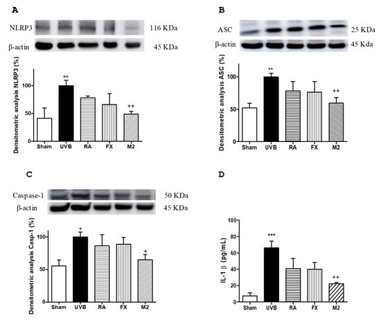 It has been well documented that inflammasome can be activated by several factors, among them UVB exposure [8]. In the present study, we demonstrated that UVB irradiation led to up-regulation of NLRP3, ASC and caspase-1 expression and, consequently, promoted a significant increase in IL-1β production in comparison with non-exposed cells (Figure 3A–D). Pre-treatment with either RA or FX at 5 µM did not significantly modify the expression levels of inflammasome-related proteins. Nevertheless, combination of RA and FX at 5 µM (M2) significantly down-regulated NLRP3 and ASC expression levels (p < 0.01) as well as caspase-1 levels (p < 0.05) in comparison with UVB-exposed cells. Furthermore, pre-treatment with M2 reduced IL-1β production in a significant manner (p < 0.01) (Figure 3D).