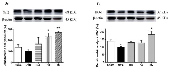 Effect of rosmarinic acid (RA), fucoxanthin (FX) and concomitant administration of RA and FX (M2) on Nrf2 and HO-1 expression in UVB-exposed HaCaT keratinocytes. Cells were pre-treated with RA (5 µM), FX (5 µM) and M2 (5 µM RA plus 5 μM FX) for 1 h, then were UVB-irradiated (100 mJ/cm2) and incubated for 24 h. Densitometry analysis of (A) Nrf2 and (B) HO-1 were performed following normalization to the control (β-actin housekeeping gene). Data shown are expressed as percentage respect to UVB-irradiated control and bars represents mean ± SEM of four independent experiments (n = 4). The mean value was significantly different compared with control group (* p < 0.05; Mann–Whitney U-test). The mean value was significantly different compared with UVB-irradiated cells (+ p < 0.05 and ++ p < 0.01; Kruskal–Wallis test followed by Dunn’s multiple comparison test.