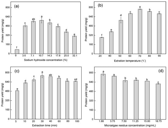 The effect of the single-factor experiments on protein yield. (a) Effect of sodium hydroxide concentration on protein yield; (b) Effect of extraction temperature on protein yield; (c) Effect of extraction time on protein yield; (d) Effect of microalgal residue concentration on protein yield. Values are averages of triplicates ± standard deviation. The different lowercase letters represent significant differences at p < 0.05.