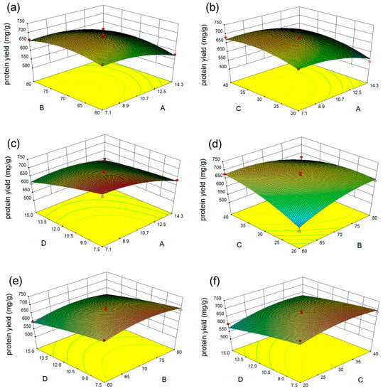 Response surface plots of the interactions between different selected factors. (a) Effect of sodium hydroxide concentration and extraction temperature on protein yield; (b) Effect of sodium hydroxide concentration and extraction time on protein yield; (c) Effect of sodium hydroxide concentration and microalgal residue concentration on protein yield; (d) Effect of extraction temperature and extraction time on protein yield; (e) Effect of extraction temperature and microalgal residue concentration on protein yield; (f) Effect of extraction time and microalgal residue concentration on protein yield. A: sodium hydroxide concentration (%); B: extraction temperature (°C); C: extraction time (min); D: microalgal residue concentration (mg/mL).