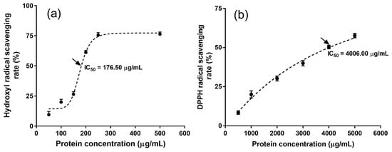 The antioxidant activity of MRPI was investigated to further evaluate the applicable value of MRPI. Hydroxyl radicals are deemed an extremely reactive free radical in living organisms, which easily react with biological molecules (e.g., amino acids, proteins, and DNA) and lead to cell damage [,]. The hydroxyl radical scavenging rate of MRPI slightly enhanced as protein concentration increased from 50 to 150 μg/mL, followed by a sharp increase with a rise in protein concentration from 150 to 250 μg/mL, and a plateau from 250 to 500 μg/mL protein (Figure 3a). The IC50 (176.50 μg/mL) of the hydroxyl radical scavenging rate was significantly greater than that of many reported proteins, such as those from sweet potato [] and rapeseed [].