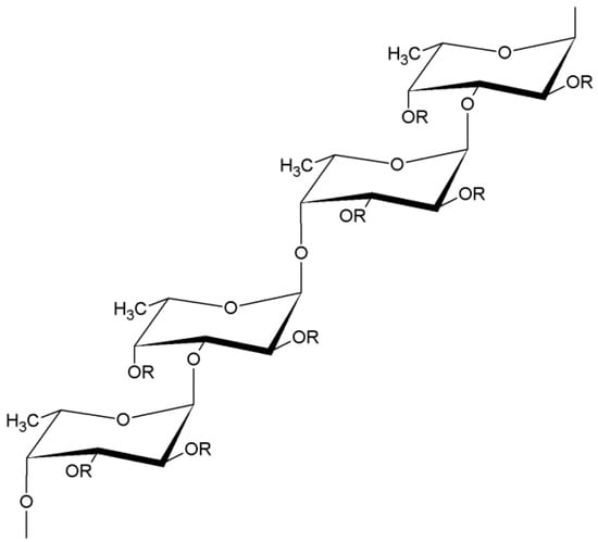 Scheme of the fucoidan structure; R- carbohydrate substituents: xylose, arabinose, rhamnose, glucose, galactose, or uronic acid and non-carbohydrate substituents: sulfate or acetate residues.