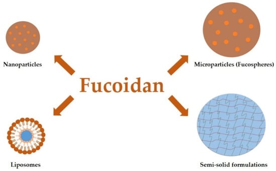 Fucoidan is the important ingredient in various pharmaceutical formulations. It can be used either as a substance with a specific therapeutic effect or as an excipient, allowing to obtain a drug form with appropriate properties. However, utilization of fucoidan in the pharmaceutical industry involves many challenges. Difficulties appear already at the acquisition stage. Differences in the growth conditions of algae, pollution of the marine environment, as well as a wide range of species that are the source of fucoidan contribute to the heterogeneity of its properties. This, in turn, leads to the necessity of matching extraction and purification methods to allow obtaining the raw material with desired characteristics [82,83,84]. Fucoidan features are also influenced by sugar composition and sulfate content, and by differential molecular weight (10–2000 kDa). Other disadvantage is lack of gelation ability, important feature in designing drug dosage forms. This limitation can be overcome by fucoidan combining with polymers (chitosan and its derivatives) or other compounds that provide a positive charge (protamine, polyethyleneimine, polyallyamine hydrochloride, poly(isobutylcyanoacrylate), poly(lactide-co-glycolide), poly-l-orithine, and hexadecylamine, poly(alkylcyanoacrylate)). The broad spectrum of biological activity of this polysaccharide per se contributes to the fact that application of designed drug carriers, like nanoparticles, liposomes, microparticles or semi-solid forms is very differential and using of fucoidan not only provides protection of the loaded active substance, but can also increase its potency and improve the effectiveness of the treatment. Due to diversified properties and potential broad area of application, the interest in fucoidan utilization in the biomedicine and pharmaceutical industry will be probably extended.