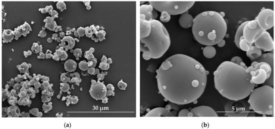 The term microparticles refers to particles with sizes ranging from 1 µm to 1000 µm. Analogously, as in the nanoparticles discussed above, among these group of particles microspheres and microcapsules can be distinguished. Microspheres prepared with fucoidan utilization are termed ‘fucospheres’. The morphology of fucospheres developed by our research team is shown in Figure 3. They were successfully obtained by the spray drying of 3% aqueous fucoidan solution (Table 1) using the Mini Spray Dryer B-290 (Büchi, Flawil, Switzerland) with experimental parameters set as follows: inlet temperature 122 °C, outlet temperature 62 °C, pressure 60 mmHg, aspirator blower capacity 100%, feed rate 2.1 mL/min.