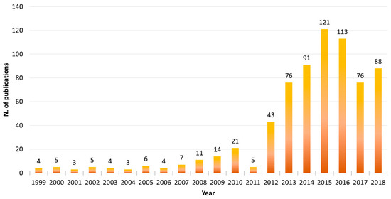 Microalgae are photosynthetic unicellular organisms that can be massively cultivated under controlled conditions in photobioreactors with relatively small quantities of micro- and macro-nutrients [8], and can thus fit perfectly into this market sector. Microalgae continue to be used in a number of biotechnological applications. Searching the available literature in the PubMed database, this trend is clearly visible (search filters used were the word “microalgae” in the Title/Abstract field and the word “biotechnolog*” in the Text Word field, using the asterisk wildcard to expand the term selection; Figure 1). Considering the full 20-year interval between “1999–2018”, it is clear that as of 2012, there has been a rapid increase in the number of publications involving both “microalgae” and “biotechnology”, reaching a peak in the years 2015–2016.