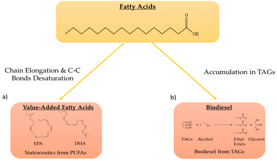 Examples of fatty acids of biotechnological interest. (a) Through various reactions of elongation and formation of double C-C bonds, poly-unsaturated fatty acids (PUFA) can be synthetized, such as eicosapentaenoic acid (EPA) and docosahexaenoic acid (DHA) with nutraceutical or food applications; (b) Accumulation in triglycerides (TAGs) and biodiesel formation via chemical transesterification.