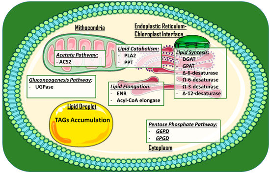 Main studied and engineered enzymes for TAGs and PUFAs in microalgae for the production of high value-added lipids. Enzymes are roughly divided in subcellular compartments. A single lipid droplet where TAGs are accumulated is added. Abbreviations: DGAT: Acyl-CoA diacylglycerol acyltransferase; G6PD: Glucose-6-phosphate dehydrogenase; 6PGD: 6-phosphogluconate dehydrogenase; GPAT: Glycerol-3-phosphate acyltransferase; ACS2: acetyl-CoA synthetase 2; PLA2: Phospholipase A2; ∆-6/∆-12-Desaturase: delta-6/delta-12 fatty acid desaturase; Ω-3/Ω-6-desaturase: omega-2/omega-6 fatty acid desaturase; ENR: Enoyl-acyl carrier protein reductase; UGPase: UDP-glucose pyrophosphorylase; TAG: Triglyceride.
