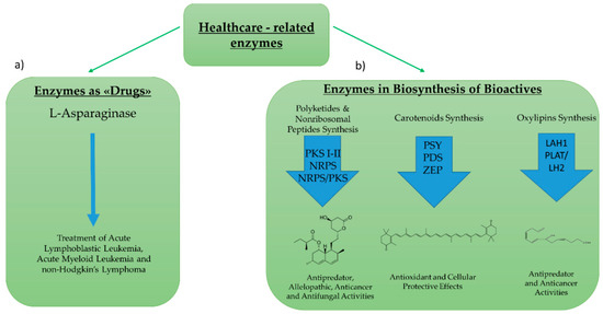 Enzymes for Healthcare Applications. Enzymes for healthcare applications can include: (a) Enzymes used directly as “drugs”, such as the l-asparaginase (b) enzymes involved in the biosynthetic pathway of active compounds, such as polyketides, carotenoids, or oxylipins. In the synthesis of polyketides, the enzymes studied are polyketide synthases and nonribosomal peptide synthases. For the synthesis of carotenoids, the most studied enzymes are phytoene synthase (PSY), phytoene decarboxylase (PDS) and zeaxanthin epoxidase (ZEP). For the synthesis of oxylipins the studied enzymes are lipoic acid hydrolases (LAH) and PLAT (Polycystin-1, Lipoxygenase, Alpha-Toxin)/LH2 (Lipoxygenase homology). An example of molecules and their roles for each pathway is also outlined.