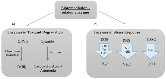 Enzymes for Bioremediation. Enzymes for Bioremediation can be: (a) Enzymes directly used for the degradation of toxicant compounds to less or non toxic versions (e.g., the hexavalent Chromium is converted to the less toxic trivalent Chromium due to the activity of Chromium Reductase); (b) Enzymes involved in cellular stress response mechanisms, such as peroxidases (Px), superoxide dismutase (SOD), and catalase (CAT) that detoxify reactive oxygen species (ROS), nitrate reductase (NR), and nitrite reductase (NiR) that detoxify reactive nitrogen species (RNS) in ammonium, and GR, that catalyzes the reduction of glutathione disulfide (GSSG) to glutathione (GSH).