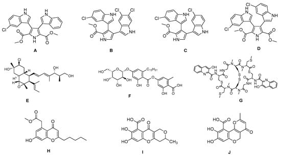 Chemical structure of marine natural compounds isolated from marine microorganisms. (A) Lynamicin E; (B) Lynamicin B; (C) Lynamicin A; (D) Lynamicin D; (E) Dehydroxychlorofusarielin B; (F) Aquastatin A; (G) Thiocoraline; (H) Pestalotiopsone F; (I) Anhydrofulvic acid; (J) Citromycetin.