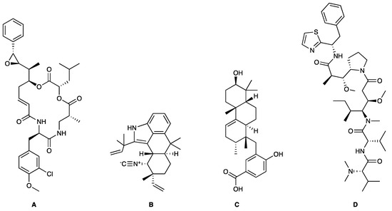 Chemical Structure of marine natural compounds isolated from marine microalgae. (A) Cryptophycin; (B) Ambiguine H isonitriles; (C) Noscomin; (D) Dolastatin 10.