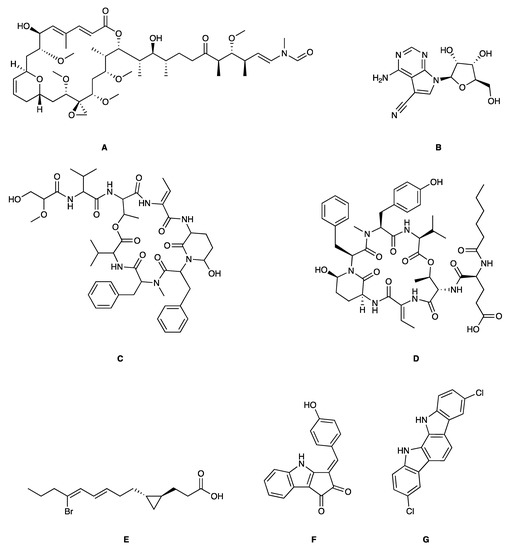 Chemical Structure of marine natural compounds isolated from marine microalgae. (A) Tolytoxin; (B) Toyocamycin; (C) Dolastatin 13; (D) Lyngbyastatin 7; (E) Majusculoic acid; (F) Nostodione A.; (G) Tjipanazole D.