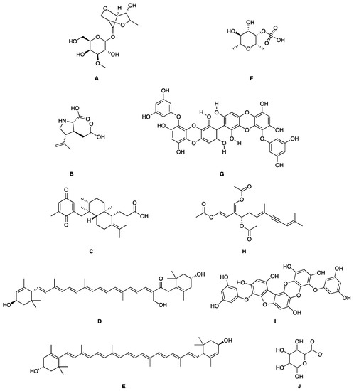 Chemical structure of marine natural compounds isolated from marine macroalgae. (A) Agar; (B) Alpha-Allokainic acid; (C) Stypoquinonic acid; (D) Siphonaxanthin; (E) Lutein; (F) Fucoidan; (G) 8,8’-Bieckol; (H) Caulerpenyne; (I) Phlorofucofuroeckol A; (J) Sodium alginate.