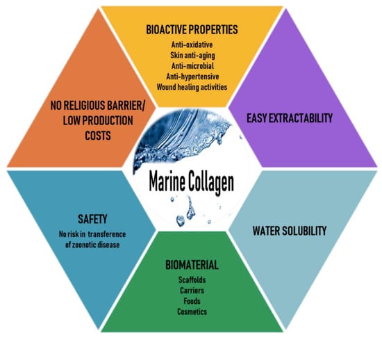 Marine organisms are a rich source of structurally novel and biologically active compounds. To date, many biological components have been isolated from various marine resources. Marine collagen (MC)—collagen derived from marine organisms such as fish, seaweeds, sponges, and jellyfish—offers advantages over mammalian collagen, as it can be easily extracted, is water-soluble, and is safe because it is free of the risks of animal diseases and pathogens such as those mentioned earlier, has better chemical and physical durability, and is available in abundant quantities [12,13]. Thus, recently, MC has attracted much attention as a mammalian collagen substitute, from biomedical researchers to the cosmetic, food, and nutraceutical industries [14,15,16]. The various beneficial characteristics of MC are illustrated in Figure 1.