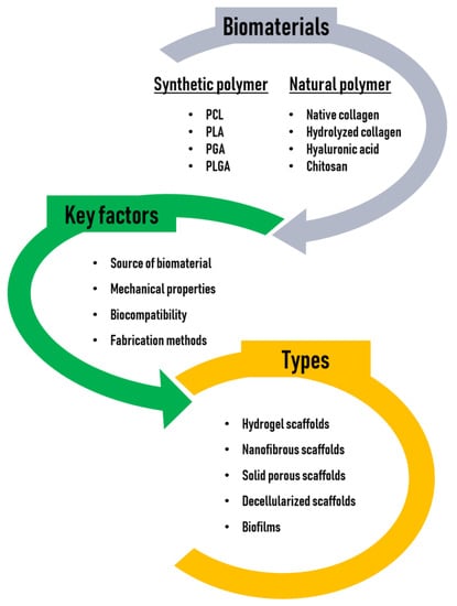 Tissue engineering scaffolds may be conductive or inductive. Conductive scaffolds, which have been widely used, provide and maintain a 3D environment that supports passive cell infiltration, thereby creating a pseudomicroenvironment, although this passive structural element does not provide sufficient information to promote full tissue regeneration in most applications. On the other hand, inductive scaffolds are designed to more closely mimic the native cellular microenvironments and may contain a wide variety of naturally occurring bioactive molecules or synthetic analogs of structural, functional, or specialized proteins and proteoglycans in the body [35]. In this regard, the tissue engineering field is transitioning to inductive scaffolding, but this approach is still faced with many problems such as time-consuming processes, shortage of cell sources, uncertain regulation of cell differentiation, the risk of host immune reactions, difficult storage and transportation of the constructs, and difficulty in controlling the generation or regeneration of functional native tissues. Thus, it presents significant challenges [36]. The biomaterials, key factors, and types of scaffolds for tissue engineering are illustrated in Figure 2.