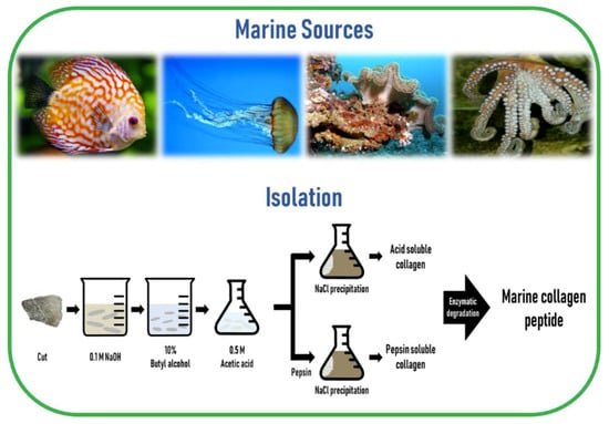 Hydrolyzed collagen (also called collagen hydrolysates or collagen peptides) is a polypeptide composite made by further acidic or enzymatic hydrolysis of collagens, but enzymatic hydrolysis is generally preferred, as it is safer, cheaper, more moderate, and less destructive than acid hydrolysis [57,58]. The molecular weight of hydrolyzed collagen is generally in the range of approximately 500–25,000 Da [59]. Hydrolyzation does not damage the integrity of the triple helix of collagen, thereby preserving the tropocollagen akin to the collagen in the living tissue. Furthermore, marine collagen peptides (MCP) are safer than those obtained from mammals, are biologically active, have improved chemical and physical properties, and an enhanced function [60,61], as well as a number of bioactive properties such as anti-oxidative, skin anti-aging, anti-microbial, anti-hypertensive, and wound healing activities, compared to their non-hydrolyzed form [51]. The schematic diagram of marine collagen isolation from marine sources is illustrated in Figure 3.