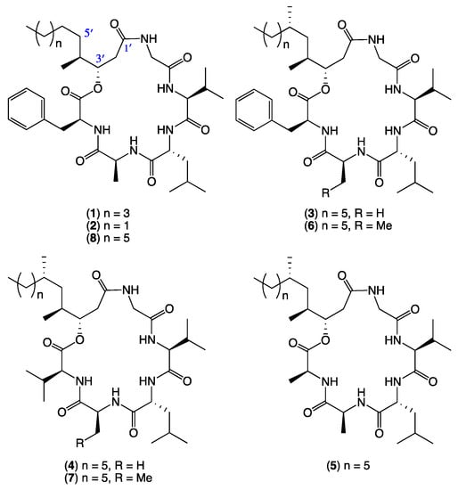 As part of our ongoing investigation into secondary metabolites from Australian marine-derived fungi, we speculated that selected bottom feeding fish species may act as natural myco-accumulators, and as such could be a readily accessible source of marine-derived fungi. Using three Mugil mullet acquired from a local fish market, we assembled a library of ~500 chemically-distinct gastrointestinal tract (GIT)-derived fungi. In a preliminary validation of the potential of this resource, we reported on an unprecedented class of hydrazine containing furano Schiff bases, the prolinimines, from Trichoderma sp. CMB-F563 [1]. Building on this achievement, we now describe an investigation into scopularide lipodepsipeptides, literature accounts of which are limited to scopularides A–B (1–2) from the marine sponge-derived fungus Scopulariopsis brevicaulis NCPF-2177 [2]. This current study was prompted by a fortuitous re-isolation of scopularides A–B (1–2) from the Mugil mullet GIT-derived Scopulariopsis sp. CMB-F458. Using 1 and 2 as authentic standards, a comparative global natural product social (GNPS) molecular networking [3] analysis of extracts obtained from ×63 co-isolated GIT-derived fungi, enabled the detection, and subsequent scaled-up cultivation, isolation and identification of the new scopularides C–G (3–7) from Beauveria sp. CMB-F585, and the new scopularide H (8) from Scopulariopsis sp. CMB-F115. Structures were assigned to 3–8 (Figure 1) on the basis of detailed spectroscopic and chemical analysis, as summarised below.