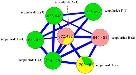 GNPS cluster for scopularides detected in a YES solid phase cultivation of Beauveria sp. CMB-F585. Green nodes are scopularides C–F (3–6), and pink nodes are minor analogues.