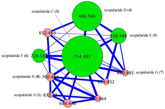 GNPS cluster for scopularides detected in a YES solid phase cultivation of Scopulariopsis sp. CMB-F115. Green nodes are scopularides A (1) and H (8), and pink nodes are minor analogues.