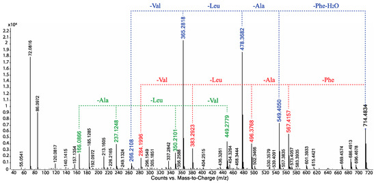 - Scopularide F (6); white powder; [α]D24.2 − 17.5 (c 0.1, MeOH); NMR (600 MHz, DMSO-d6) see Table 2 and Table S8, Figures S29–S33; ESI(+)MS m/z 728 [M + H]+; HRESI(+)MS m/z 750.4787 [M + Na]+ (calcd. for C40H65N5O7Na, 750.4776); GNPS library CCMSLIB00005436486.