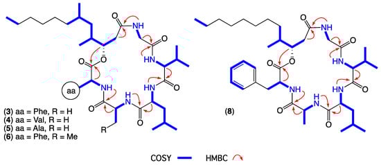 Diagnostic 2D NMR (DMSO-d6) correlations for scopularides C–F (3–6) and H (8).