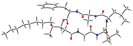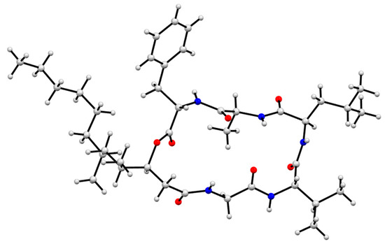 GNPS analysis of the EtOAc extract obtained from a YES solid phase (40 × agar plate) cultivation of Scopulariopsis sp. CMB-F115 detected the presence of the prominent new scopularide H (8) and the known scopularide A (1) (Figure 8). Solvent extraction and partitioning of the EtOAc extract, followed by reversed-phase HPLC, yielded the known scopularide A (1) together with the new analogue 8. HRESI(+)MS analysis of scopularide H (8) revealed a molecular formula (C38H61N5O7) consistent with a lower homologue (−CH2) of 3. A diagnostic of MS/MS fragmentations (Figure S45) and 1D and 2D NMR (DMSO-d6) (Table 2 and Table S9, Figure 6 and Figures S34–38) established the amino acid sequence Phe1-Ala2-Leu3-Val4-Gly5. Finally, the complete structure for scopularide H (8), including absolute configuration about the amino acids and 3S,4S-3-hydroxyl-4-methyllauric acid (3S,4S- HMLA) lipid residue, was confirmed by single crystal X-ray analysis (Figure 9 and Figure S56).