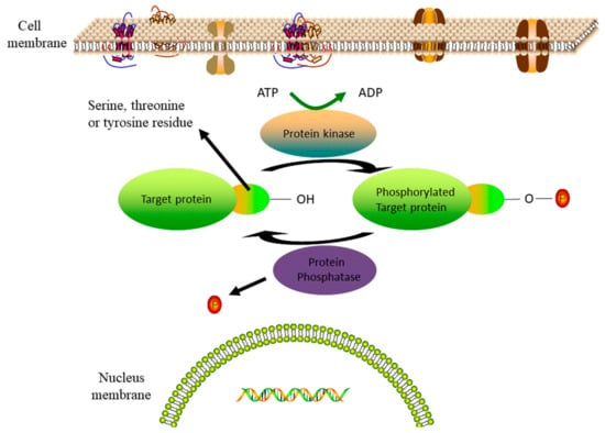 Most of the kinase inhibitor drugs approved thus far are adenosine triphosphate (ATP) competitive inhibitors that have various practical off-target liabilities. Four major classes of kinases exist in mammalian signaling pathways, and these can be classified broadly by substrate specificity: Serine/threonine kinases, tyrosine kinases, dual kinases (both Ser/Thr and Tyr), and lipid kinases [14]. Protein kinases share a common mechanism that is demonstrated in Figure 1, in which the protein function is activated or inactivated by the transfer of a phosphate group from ATP to the free hydroxy of a serine, threonine or tyrosine on the targeted protein, whereas protein phosphatases remove a phosphate group from phosphorylated amino acids and thereby effectively reverse the effect [15,16,17,18]. There are 38 FDA-approved small molecule kinase inhibitors available for the treatment of different diseases, such as cancers, immunological, inflammatory, degenerative, metabolic, cardiovascular and infectious diseases [19,20], and many more candidates still in clinical development. Some new biological therapeutics, in the way of monoclonal antibodies, have been discovered or engineered to successfully target some kinases [21,22]. A major challenge in the development of new kinase inhibitors is to overcome the toxicity or non-specificity of the existing drugs that act as ATP binding site competitors. Since small-molecule natural products are produced by and interact with proteins in their natural settings, some are known to function as signaling molecules among many forms of life and have been creatively repurposed for human health applications. Accordingly, some marine natural products have served as drug lead compounds, and these provide an abundant resource for the discovery of next-generation kinase inhibitors that target allosteric regions away from the ATP binding sites [23,24,25,26] or by stabilizing inactive conformations to prevent the function of certain kinases [27,28,29,30]. This is particularly relevant for the treatment of cancers and bacterial infections.