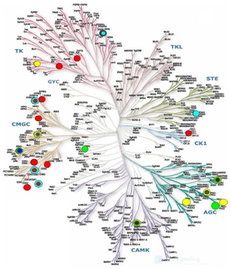 Availability of some marine-derived kinase inhibitors with activity on the phylogenetic tree of the human protein kinase family. Color codes indicate the producing or source organisms. Yellow: Marine bacteria. Green: Marine fungi. Gray: Marine soft coral. Light blue: Marine animals. Dark blue: Marine algae. Red: Marine sponges. Adapted from refs [31] and [32] with permission, the original illustration reproduced courtesy of Cell Signaling Technology, Inc. (www.cellsignal.com), 2019.