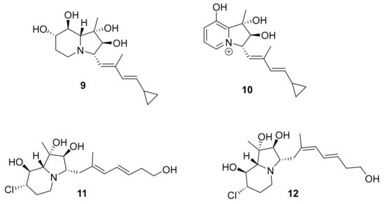 Structures of cyclizidine-type alkaloids 9–12.