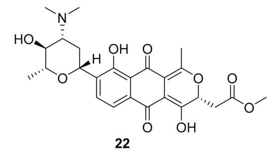 From the marine bacterium Streptomyces sp. XMA39, Yong-Jun Jiang et al. in 2018 isolated the known compound medermycin, and four new structurally related naphthoquinones, strepoxepinmycins A–D [43]. All of these marine natural products were growth inhibitors for different human pathogenic bacteria, and compound 22 (Figure 9) showed ROCK2 inhibition (IC50 > 20 μM) and cytotoxic activity against HCT-116 and PC3 cancer cells in vitro with IC50 > 40 mM [43].