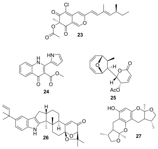 In 2017, Dong-Ni Chen et al. reported the structure of sclerotiorin (23, Figure 10) isolated from the marine fungus Penicillium sp. Strain ZJ27 [44]. At the same time, sclerotiorin was shown to very weakly inhibit PknG (IC50 = 76.5 μM) [44]. In 2014, Dong-Cheol Kim et al. reported that methylpenicinoline (compound 24, Figure 10) was isolated from marine fungus Penicillium sp. and inhibited p-p38 MAPK pathways, although no specific activity value was noted [45]. The authors proposed that 24 might be useful for further development toward the treatment of inflammatory and neuroinflammatory diseases, so the results of ongoing work may demonstrate their follow-up. Mycoepoxydiene (25, Figure 10) was reported in 2014 by Wen-Jiao Li et al., after it was isolated from the marine fungal strain Diaporthe sp. HLY-1 [46]. Compound 25 was shown to induce apoptosis and inhibit phosphorylation of IKK, and it was suggested that the inhibition of IKK activity and human cholangiocarcinoma (CCA) cells such as SK-ChA-1 (IC50 =12.5 ± 0.2 μM) and Mz-ChA-1 (IC50 = 35.6 ± 0.2 μM) may fully or partially explain the observed apoptosis [46]. These results suggest that compound 25 could be used as a lead molecule for the design and development of potent and selective new inhibitors of IKK with a potential for therapy of human cholangiocarcinoma disease [15,46]. In 2014, Kunlai Sun et al. reported a new indole-diterpenoid (26, Figure 10) that was isolated from the marine fungus Aspergillus flavus OUCMDZ-2205 [47]. This compound was found to inhibit PKC-β (IC50 = 15.6 μM), at 10 μM arrested A549 cells in the cell cycle S phase, and showed antibacterial activity against Staphylococcus aureus (MIC = 20.5 μM) [47]. In 2015, Wen-Liang Chen et al. isolated xyloketal B (compound 27, Figure 10) from the fungus Xylaria sp. (No. 2508) that was collected in a mangrove [48]. Compound 27 was shown at 300 μM to inhibit p-Akt (inhibition rate ~ 34%) and p-ERK1/2 (inhibition rate ~ 40%) protein expression in vitro, and the determinants of anti-proliferation and migration effects against glioblastoma U251 cells (IC50 = 287.1 ± 1.0 μM) in vitro included TRPM7-regulated PI3K/Akt and MEK/ERK signaling [48].