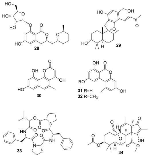 - Wiese, J.; Imhoff, J.F.; Gulder, T.A.; Labes, A.; Schmaljohann, R. Marine Fungi as Producers of Benzocoumarins, a New Class of Inhibitors of Glycogen-Synthase-Kinase 3β. Mar. Drugs 2016, 14, 200. [Google Scholar] [CrossRef]